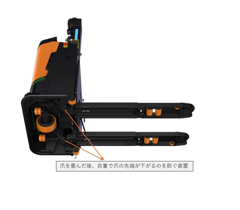 専用機構で、ロードホイルを畳んだ後、爪の自重による傾きを矯正し、常に爪を水平に保つことが可能。