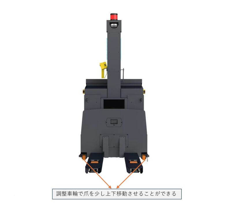 専用補助輪で爪の高さを少し上下動かすことが可能で、カメラでパレットを識別後、差し込み口に合わせて高さを自動調整をし、よりスムーズに田の字のパレットを引き取ることができます。