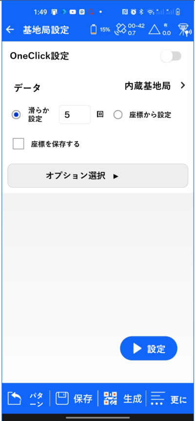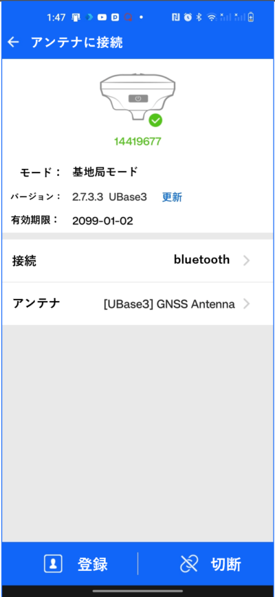 まずは本体のRTKアンテナーのモードを基地局モードに切り替える、これで最寄りの基地局を探して自動的に接続します。