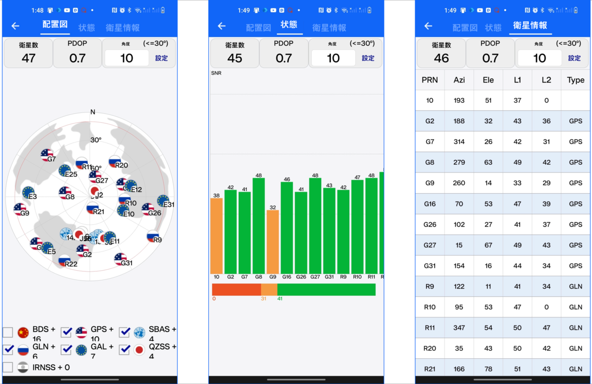 接続する衛星に選択をして頂くと、各衛星の電波の強さなどの情報を確認できます、今回はインドの衛星と中国の衛星北斗を無しでテストして見ました、GPSは10個すべて選択をし、日本が打ち揚げたみちびきは4個やヨーロッパのガリレオなど、合計47個の衛星を選択しました。